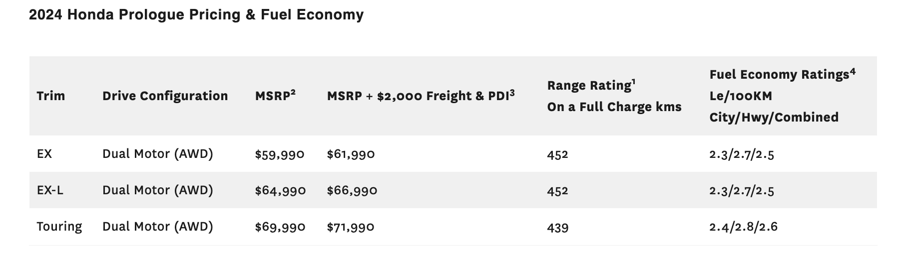 The all-new 2024 Honda Prologue, the first all-electric Honda SUV, will begin arriving in Honda dealerships this spring, boasting a 452 km EPA range rating1, the highest standard driving range in its class. The Manufacturer’s Suggested Retail Price (MSRP) begins with the exceptionally well-equipped Prologue EX at $59,9902.